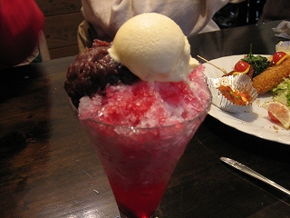 | フラッペ | なぜか飲んべぇに人気のフラッペwこれは全部のせ (イチゴフラッペ+アイス+金時+ミルク) |