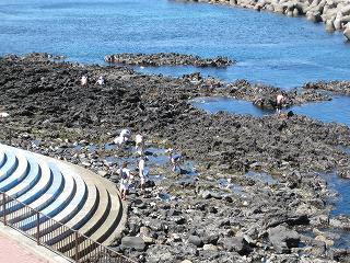 干潮になると岩場が出てきて、ここで小魚や小エビ、貝類などが